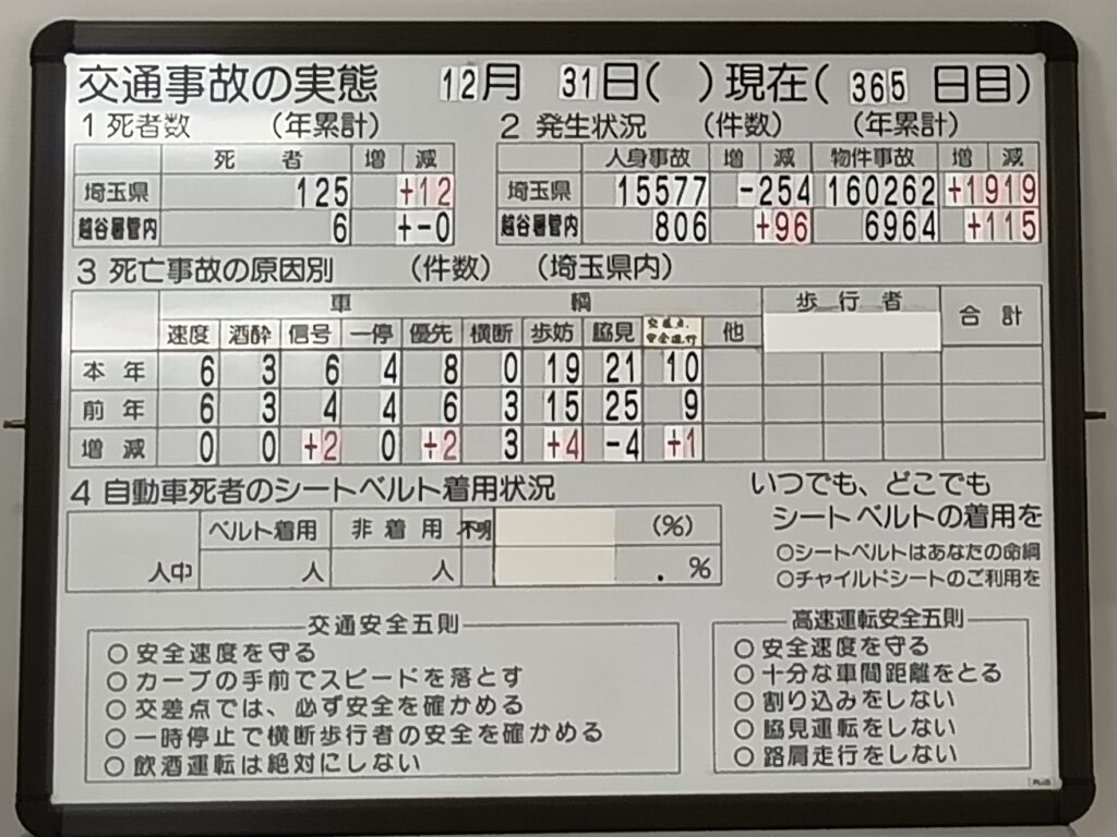 埼玉県、越谷管内での交通事故統計は以下の通りです。この10年の事故数、とくに死亡事故は減少局面でしたが、近年は微増しているそうです。物件事故の件数はずっと横ばいだそうです。