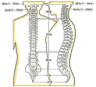 ”サーヴィカル” Cに上から順番に数字がつき、7つまでありましす。C1は環椎、C2は軸椎と別称があります。