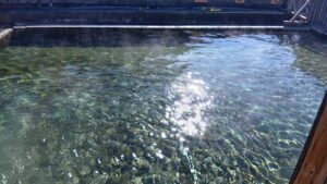 泳げる温泉はいくつかありますが、伊豆下田の金谷旅館が一番でしょうか。こちらは木造の屋内プールです。直線で15mほど泳ぎ、胸まである水深からクイックターンも可能です。繰り返しますが、泳げるのは独泉=一人の時だけです。