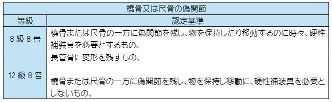 以上の治療と検査から、骨折部が癒合しなかった場合は長管骨の変形で12級8号が該当しますが、癒合を果たせなかった場合の多くは肘関節の可動域制限も生じる傾向です。変形より上位の機能障害として、以下の表より認定される事になります。