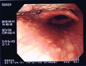 検査では、ファイバースコープで、声帯の動きを観察し、診断されています。原因を特定するには、頚部、胸部のXP、CT、食道造影、上部消化管内視鏡検査などが行われます。その他に、筋電図や発声時のX線透視検査を行って鑑別されています。筋電図検査は、麻痺の程度や回復の見込みを判断する上で、極めて有用な検査です。