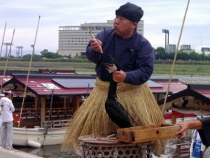 (右)鵜飼いの説明。ぶっきらぼうな語り口調ですが味わいにあふれています。