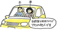 ※付随論点1 任意保険と自賠責の違いはこの「他人」の範囲で、自賠責では配偶者や家族は他人扱いとなり、賠償の対象になります。この解釈はいくつかの判例で確定しています。たとえば加害運転者が契約者である主人、同乗の被害者がその配偶者の場合、任意保険は免責ですが、自賠責は有責となります。