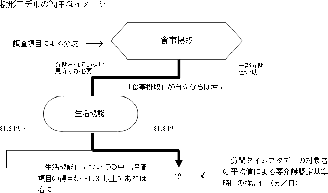 4.① 一次判定のコンピュータシステムは、認定調査の項目等ごとに選択肢を設け、調査結果に従い、それぞれの高齢者を分類してゆき、「1分間タイムスタディ・データ」の中からその心身の状況が最も近い高齢者のデータを探しだして、そのデータから要介護認定等基準時間を推計するシステムです。この方法は樹形モデルと呼ばれるものです。